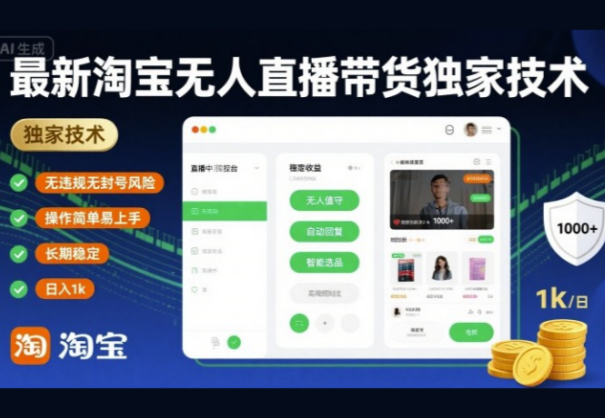 最新淘宝无人直播带货独家技术,无违规无封号风险,操作简单易上手,长期稳定日入1k