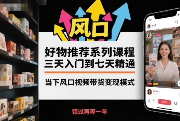 好物推荐系列课程,三天入门到七天精通,当下风口视频带货变现模式
